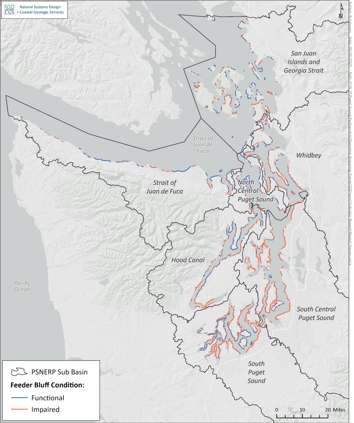This indicator measures the amount (length and percent) of feeder bluffs in functional condition in Puget Sound. We assessed feeder bluff function by considering the ability of bluffs to contribute sediment to the shoreline system without restriction from shoreline armor. Data used in this assessment included shoreline mapping compiled for Beach Strategies (Coastal Geologic Services 2017) and from newer data compiled in this effort. We analyzed the data in a few different ways, including by geography (subbasins in Puget Sound), by feeder bluff type (FB, FBE, and FB-T), and by drift cell.