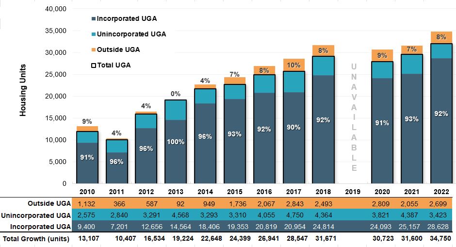 In recent years, growth inside of UGAs has remained steady as a share of total growth.