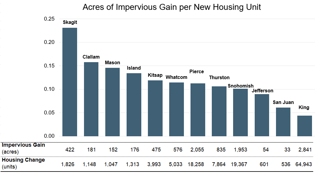 This indicator measures acres of new impervious surface area in residential zones per net new housing units built. Increasing housing units in areas with existing impervious surface, such as through new apartment buildings and other multi-unit housing, is an effective way to support population growth while protecting sensitive habitats. A lower value in this indicator suggests that more new housing was located in areas with existing impervious surfaces which can support the protection of sensitive habitats.