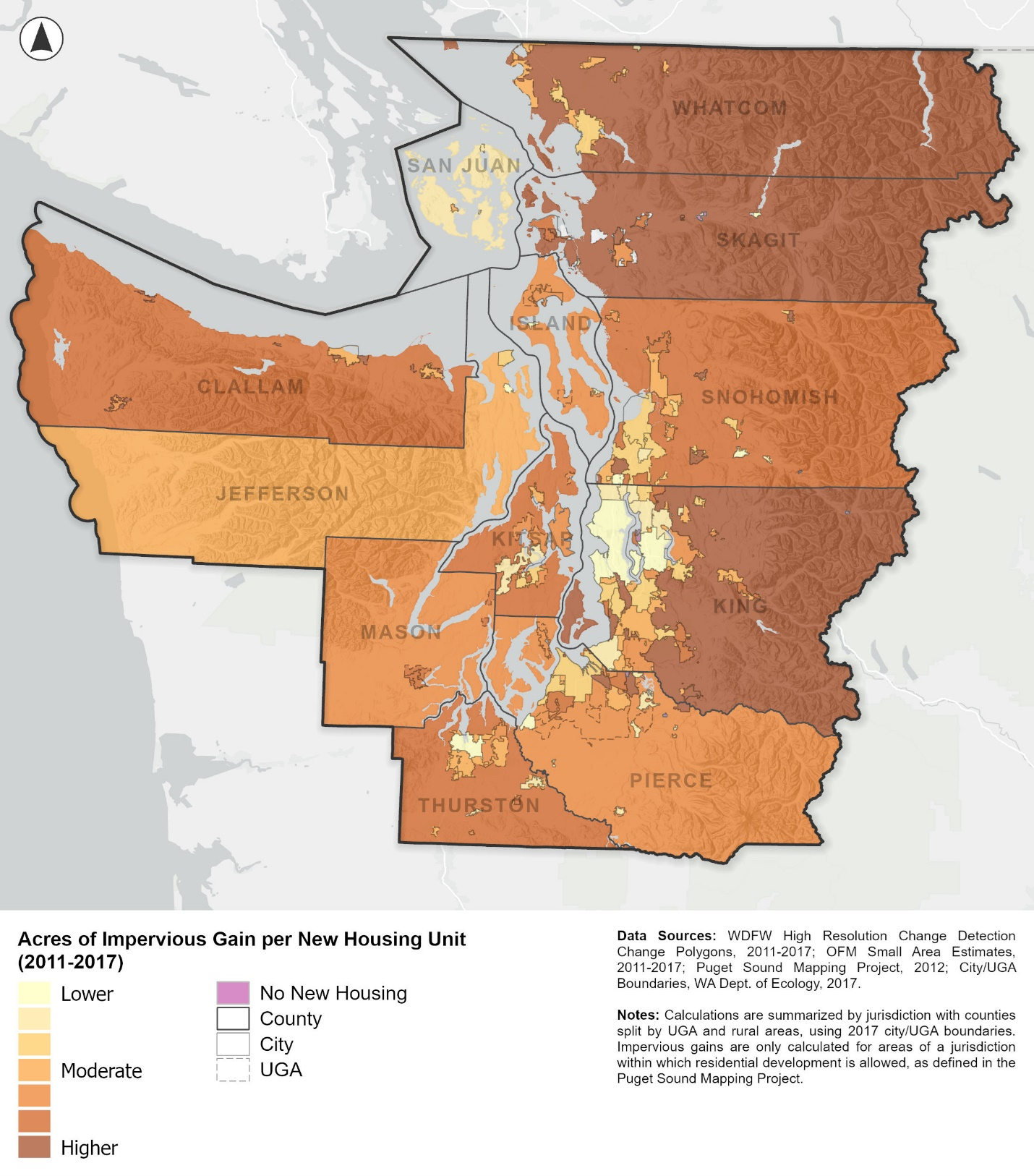 Impervious surface change polygons for 2011 and 2017, Washington Department of Fish and Wildlife’s High Resolution Change Detection program.